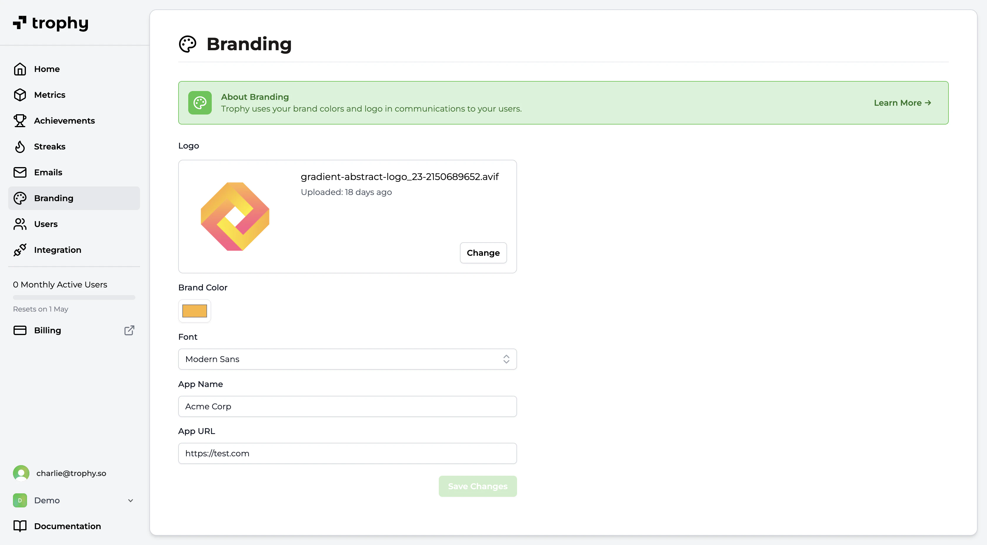 The branding page in the Trophy dashboard allows you to configure the following account-level settings. These setting will be used in any communications you configure Trophy to send to users, like Emails.