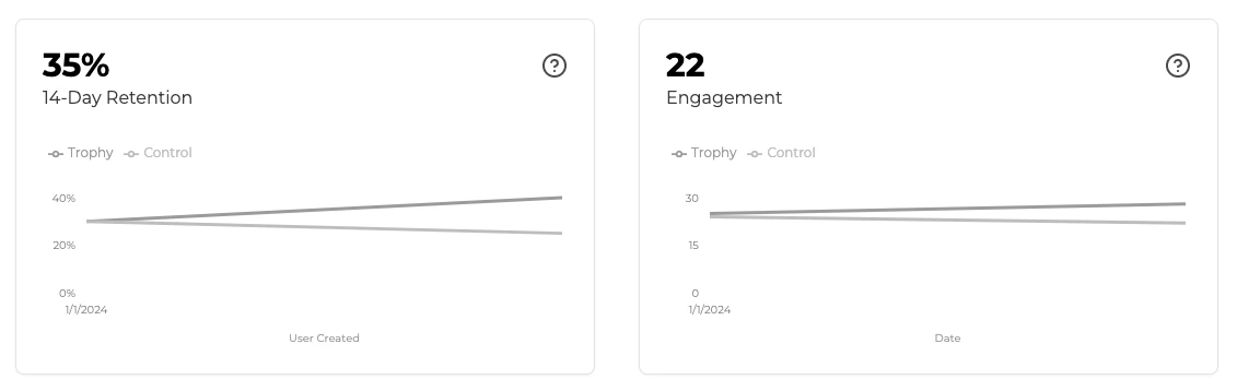 Both retention and user engagement are important metrics to use when measuring the impact of changes on the user experience. The following sections outline what each means and how it relates to features you build with Trophy.Retention