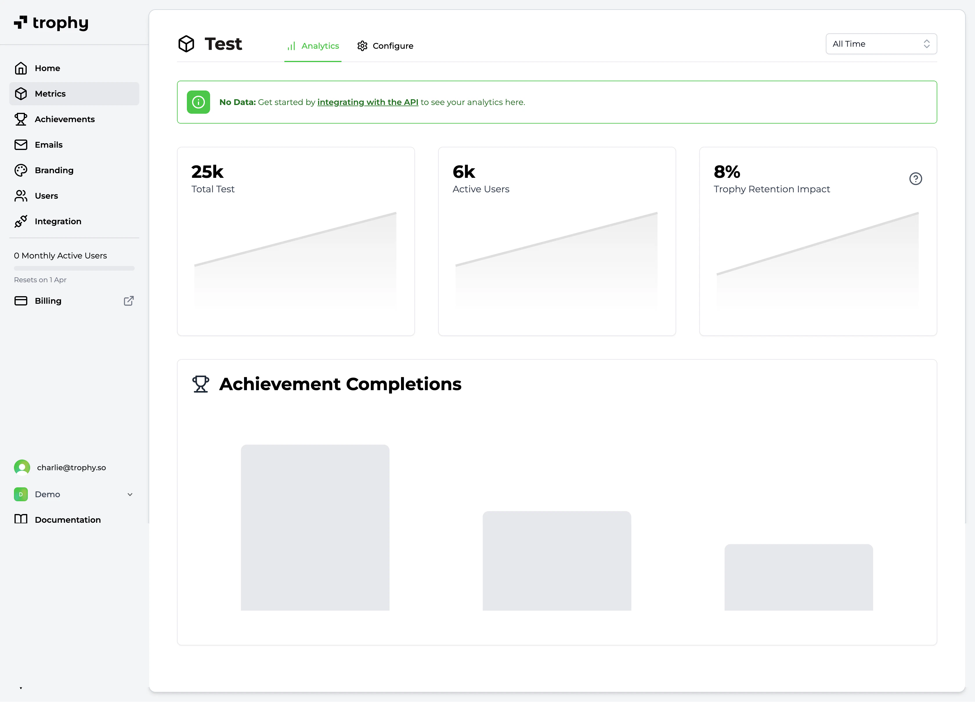 All gamification features are centered around user interactions. At Trophy, we use the term Metrics to refer to the data objects that model those interactions within your web or mobile app. Metrics are un-opinionated, meaning they can be used to model absolutely any user interaction you can think of. Examples could include:- Followers, likes or posts